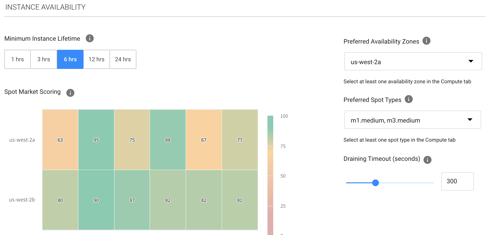 - Minimum Instance Lifetime: The desired amount of time you wish your workloads to run without any interruption to their underlying instances. The shorter the lifetime you choose, the more accurate the market scoring will be.
