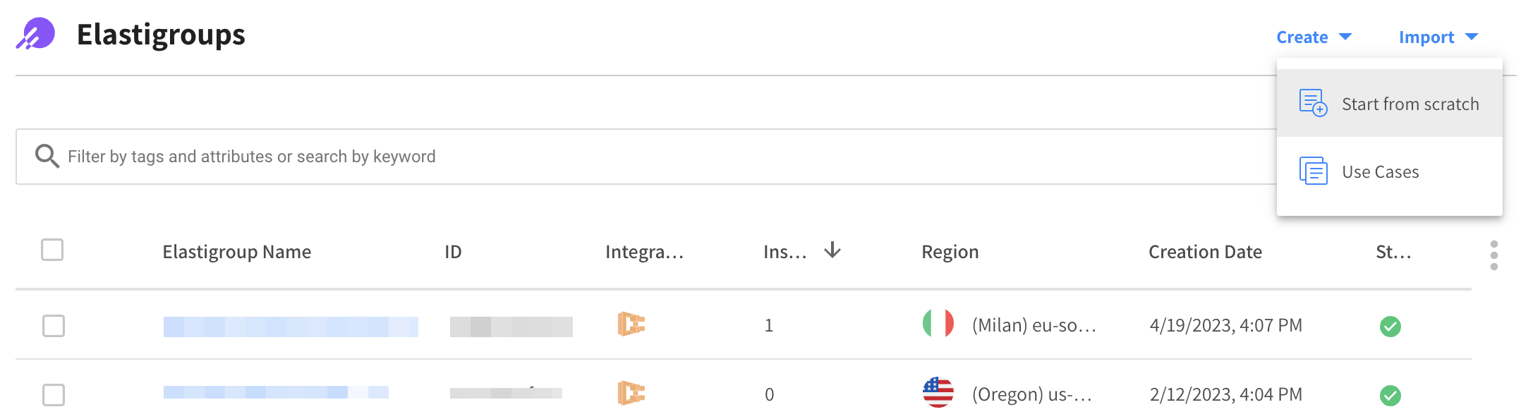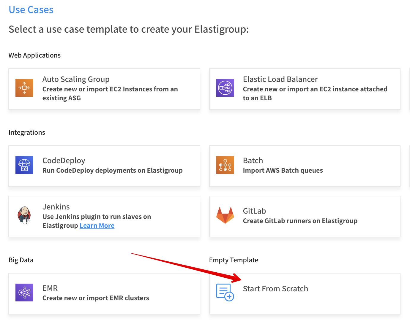 You can create an Elastigroup using an empty template. To create an Elastigroup based on an existing workload such as AWS Elastic Beanstalk or AutoScaling Groups, choose your workload type under Use Cases and import a copy of your workload configuration.