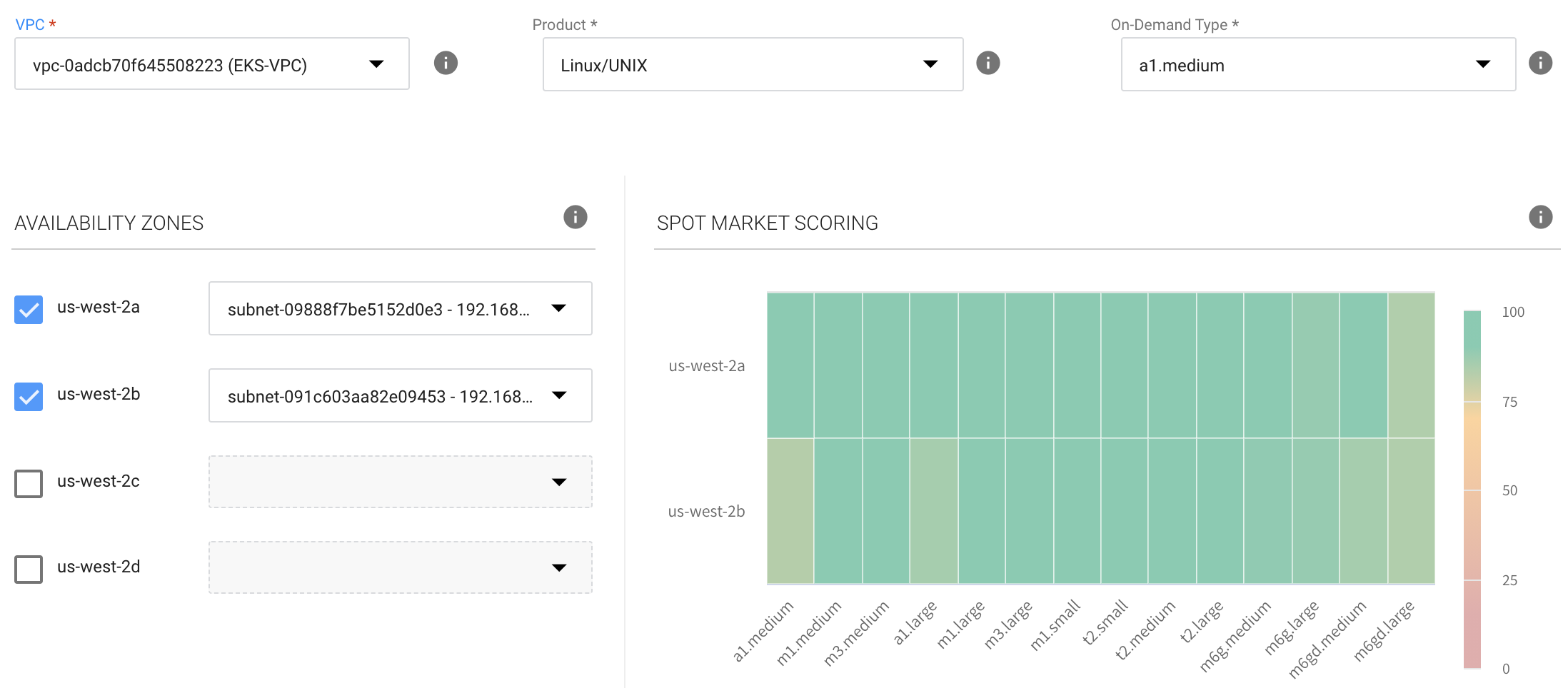 Choose one or more Availability Zones (AZs) Elastigroup should consider when launching your instances. To maximize your savings, Elastigroup calculates the cost of launching spot instances in the selected AZs. We recommend selecting multiple Availability Zones to increase the number of spot instance markets available for Elastigroup to consider.