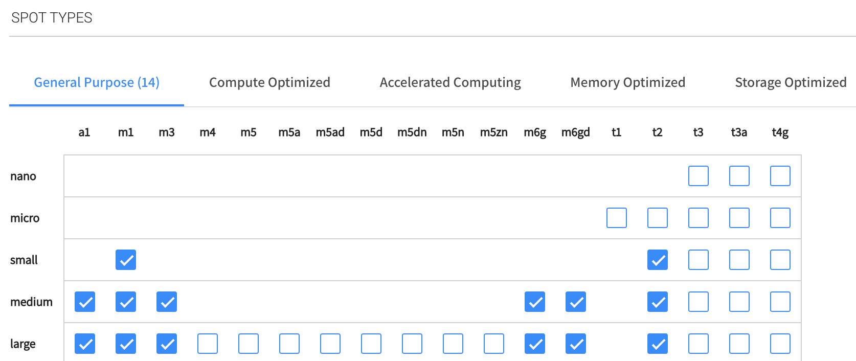 Spot Types: Choose the instance types Elastigroup should consider when launching your instances. We recommend selecting multiple instance types to provide Elastigroup with as many Spot instance market options as possible.
