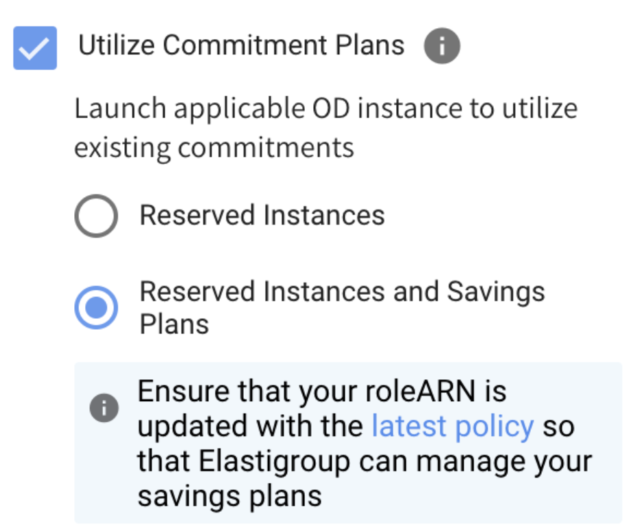 Elastigroup will automatically provision on-demand instances if there are any vacant Savings Plans or reserved instances that match any instance type defined in the Compute page. The utilization order is: RIs, EC2 SP, Compute SP. Choose one of the following: