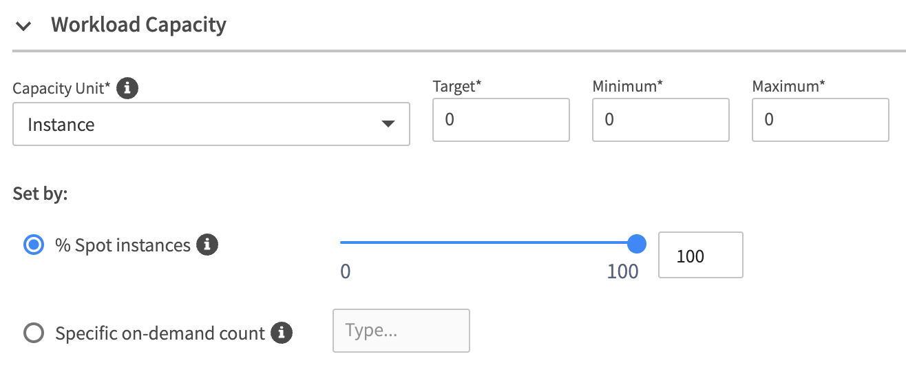 - Set by % of spot instances: Percent of total instances that should be spot instances. The rest will be on-demand instances.