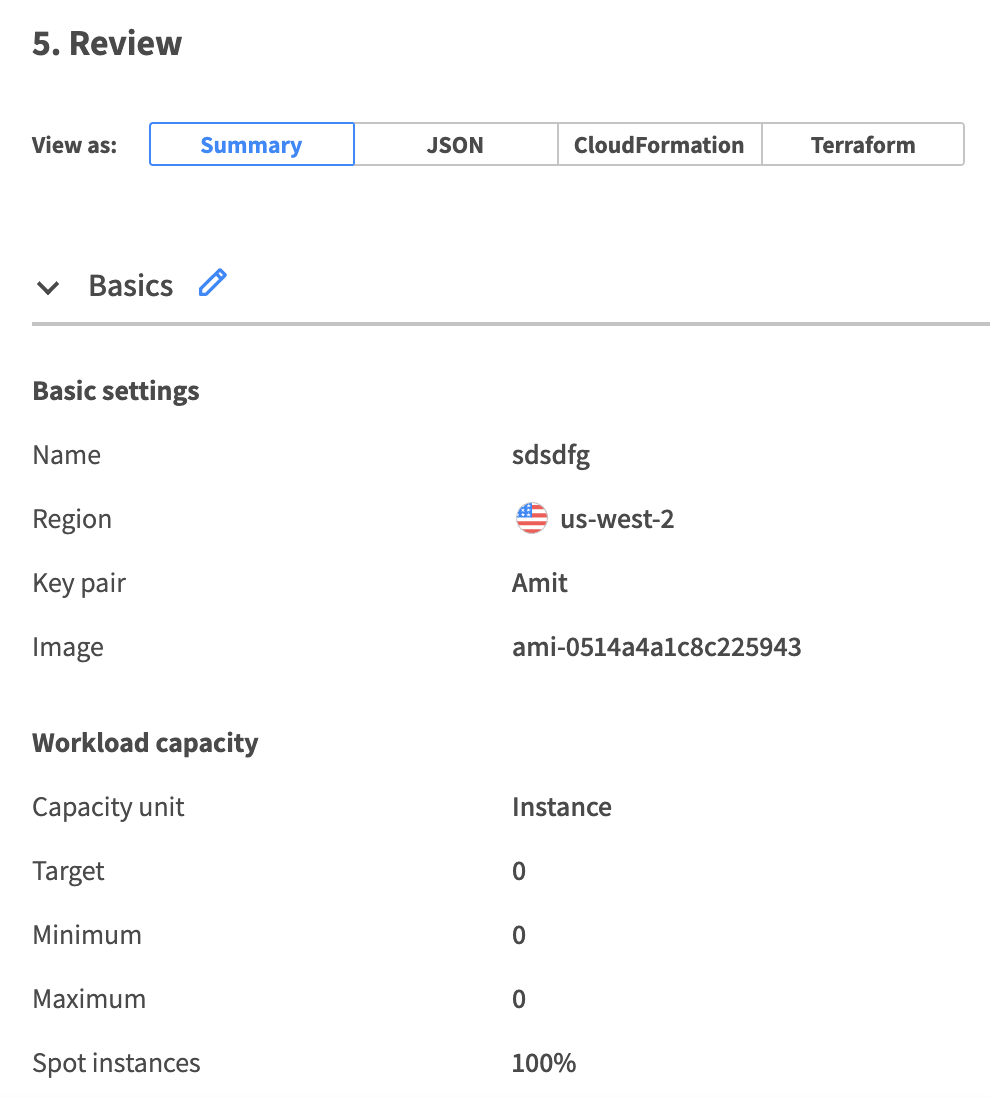 When you have finished filling in the information in the template, you can review the configuration and edit it in JSON, CloudFormation or Terraform formats.